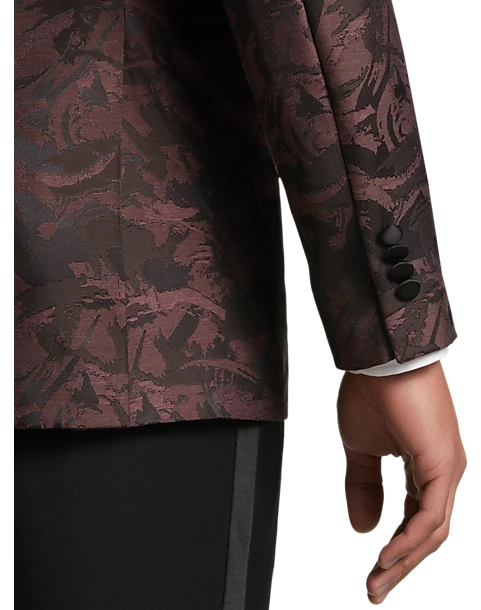 Create your own formal look with flair. This fine dinner jacket features a deep ruby red hue with a black floral pattern accented with a satin lapel and details throughout.