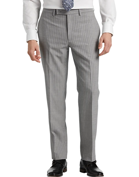 In a Classic Fit this fine suit from Michael Strahan features a traditional gray stripe. A notch lapel coat flat-front slacks and a five-button vest complete this versatile look.