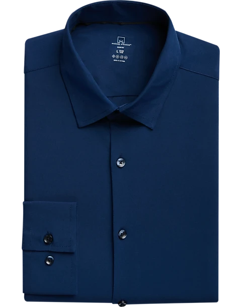 Look your best in the ultimate active wear dress shirt by Michael Strahan. This handsome dress shirt keeps you cool and comfortable and allows freedom of movement with lots of stretch woven in. Modern Fit is close-fitting without being constricting through the chest, body, and sleeve. Recommended for more rectangular body types (shoulders aligned with hips, with the waist slightly smaller).