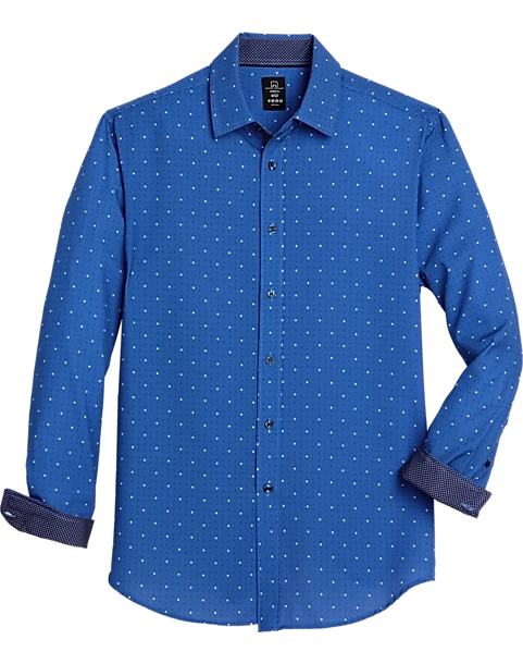 Bold and sporty in a navy swirl dot pattern, this standout sport shirt from Collection by Michael Strahan features a trim, Slim Fit, contrast lining in the cuffs, and a comfortable performance fabric with 4-way stretch.