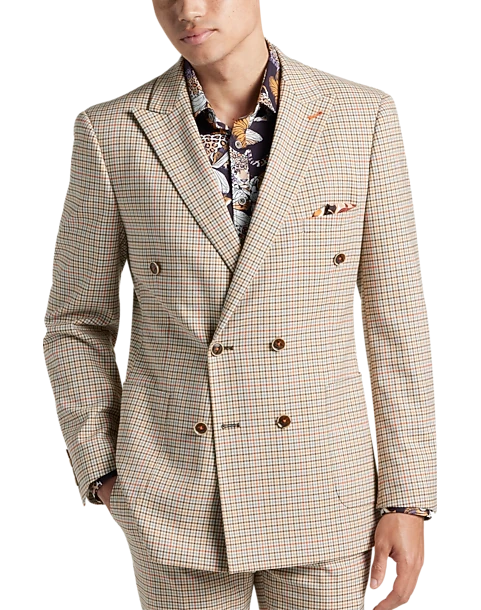 - 64% polyester 34% rayon 2% spandex|Double breasted|Peak lapel|Side vents|Coordinating pieces sold separately|Slim Fit|Paisley & Gray|