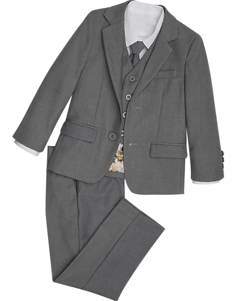 Dress your little gentleman in big guy style with this five-piece complete tuxedo set. Tailored with a Slim Fit, this stylish children’s suit is perfect for weddings, especially for ringbearers, and any other formal wear occasion. This handsome collection features a dress shirt, pre-tied tie, vest, coat, and slacks.