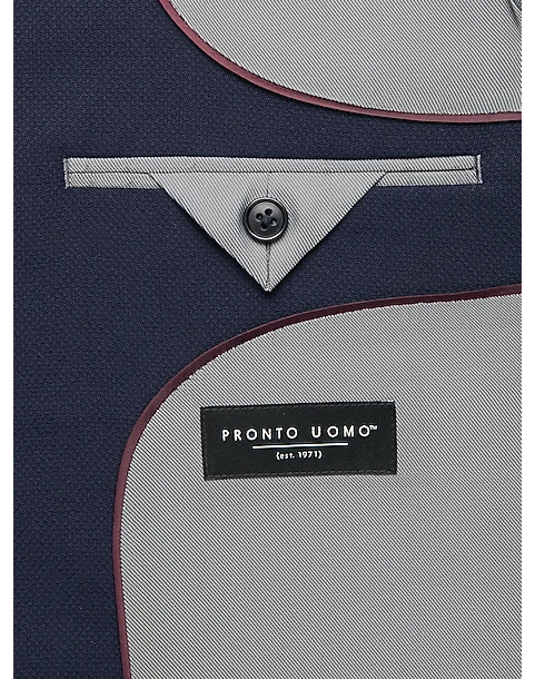 - 52% wool 45% polyester 3% spandex|Notch collar|Two-button closure|Left chest pocket and two hacking pockets|Side vents|Three interior pockets|Fully lined|Modern Fit|Pronto Uomo|