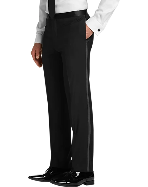 A satin notch lapel brings a refined note to this all-black formal wear staple. Flat-front trousers feature a satin waistband and stripe down the leg, adding polish to the timeless look.