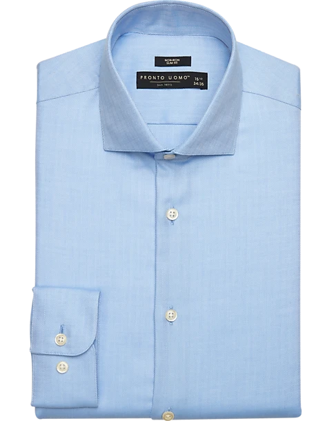 With a Slim Fit for a trim look that leans more modern, this dress shirt from Pronto Uomo offers the added convenience of a non-iron finish to put wrinkles in their place. Slim Fit is slim and tapered across the chest, shoulders, armholes, waist and sleeves without compromising on comfort. Recommended for more triangle body types (broad shoulder and chest, narrow waist and hips).
